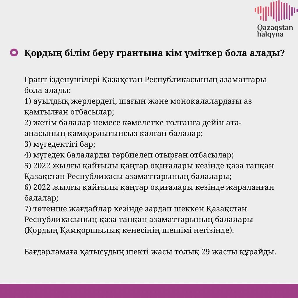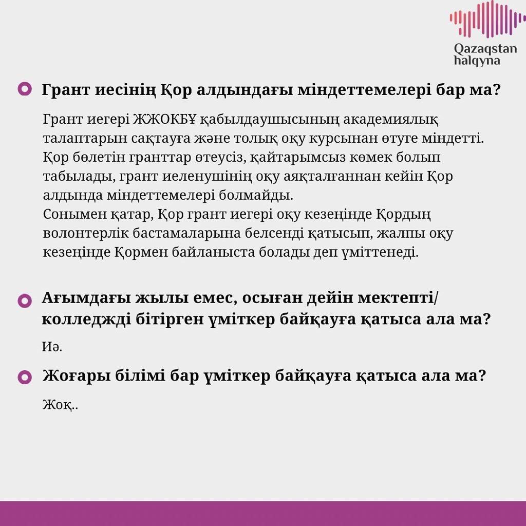Құрметті түлектер мен жоғары оқу орнының студенттері! «Қазақстан халқына» қоры «Қазақстан халқына» қоғамдық қорының білім беру гранттары» қайырымдылық бағдарламасын жүзеге асыру аясында гранттар мен шәкіртақылар беруге конкурс жариялайды!