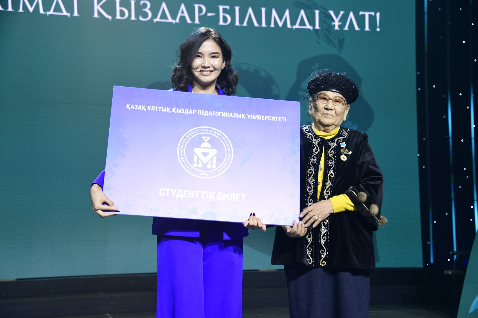 В ходе юбилейного вечера гости мероприятия насладились концертной программой. Выпускница Университета, заслуженный педагог Казахстана Орынша Карабалина вручила студентке первого курса Студенческий билет.